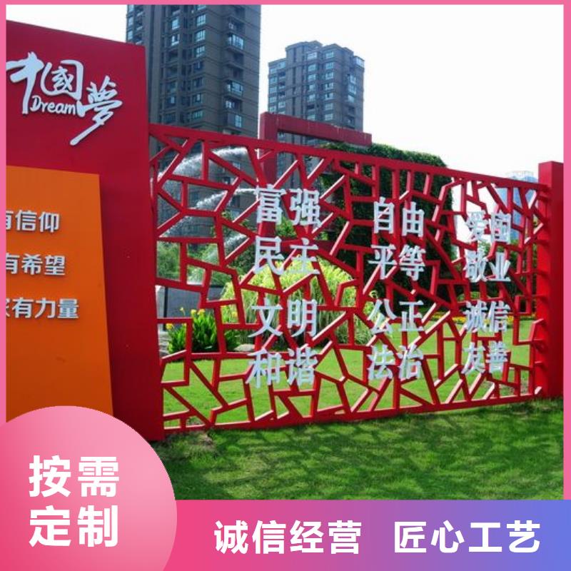 核心价值观标识牌景观小品雕塑具有浓郁的中国风,所以其设计必须要从我国传统文化还有当地的文化特色中汲取营养和灵感,从中提炼出各种抽象具象的符号或者图案造型应用到核心主义价值观标牌的设计当中去。 注重艺术性功效的彰显作为社会主义精神的宣扬载体,同时作为城市或者乡村空间的艺术装饰物,我们在设计中要重视中国梦核心价值观标识牌对空间环境的美化作用。注重核心价值观艺术性功效的彰显,并不是一种舍本逐末的做法,兼具实用性与艺术性的社会主义核心价值观标识牌可以在我们需要它的时候,给予我们心灵上的鼓舞和指引,而我们不需要它的时候,它与周边环境融为一体、相映成趣,所以我们要寻求核心价值观功用性与艺术性的一个 平衡点,不能顾此失彼,而是要力求两相得宜。